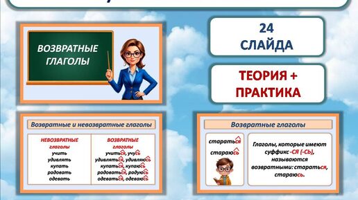 Презентацию скачать здесь Презентация «Возвратные глаголы» разработана к уроку русского языка в 4 классе. Презентация состоит из 24 слайдов. Данная разработка предназначена для изучения одной из важных тем русского языка. В ней в доступной и наглядной форме объясняется, что такое возвратные глаголы, как они образуются и в каких случаях употребляются. Материал выстроен последовательно: от общего понятия глагола к введению возвратной формы с суффиксом -ся (-сь). Особое внимание уделяется примерам, сравнению возвратных и невозвратных глаголов, нормам правописания суффикса -ся (-сь)...