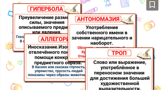 Изобразительно-выразительные средства языка 29 листов-памяток формата А4 к урокам литературы и русского языка в 5-11 классах. Даны краткие, понятные определения выразительных средств языка с примерами из литературы. Можно использовать для фронтальной работы с классом, а также для работы в группах. Дидактический материал включает: Троп, антономазия, аллегория, гипербола, гротеск, ирония, литота, метафора, метонимия, олицетворение, перифраза, синекдоха, сравнение, эпитет...