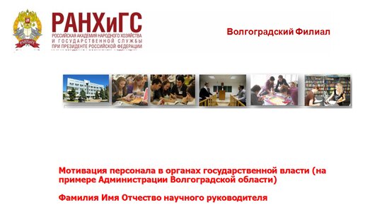 Слайд 1 Уважаемый председатель! Уважаемые члены государственной аттестационной комиссии. Разрешите представить вашему вниманию выпускную квалификационную работу на тему: «Мотивация персонала в органах государственной власти (на примере администрации Волгоградской области). Фрагмент презентации предоставлен для ознакомления. Презентации в Microsoft PowerPoint для дипломных работ. Консультационные услуги для студентов. Перейти на сайт. Написать: Telegram / WhatsApp / ВКонтакте / Т. 7-988-027-88-34...