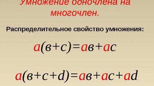 ()Процесс открытия скобок называется "раскрытием скобок" или "раскрыванием скобок". Этот процесс заключается в умножении каждого члена внутри скобок на число или выражение за скобками. "Раскрытие скобок" это процесс, обратный обобщенному правилу дистрибутивности умножения относительно сложения! Для умножения одночлена на многочлен(скрытие скобок) можно применить следующий алгоритм: Пример 1: 3 *...