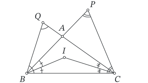 Выберите все верные равенства. 1. BP=CQ По равным углам при основании, мы можем утверждать что треугольники BPC и BQC равносторонние. При чем BP=BC и CQ=BC, из чего однозначно следует, что BP=CQ. 2. BI=IC 3. BI=IP 4. BI=IA 5. BI=IQ Рассмотрим треугольники CIQ и BIC. Они равны по 2м сторонам и углу между ними - сторона CI общая, CQ=BC это мы уже выяснили, и углы С равны по условию. Выходит, что в треугольнике BQC углы B и Q образованы путем вычитания из угла обозначенного душкой угла обозначенного перечеркнутой душкой, а значит углы равны и треугольник равнобедренный...