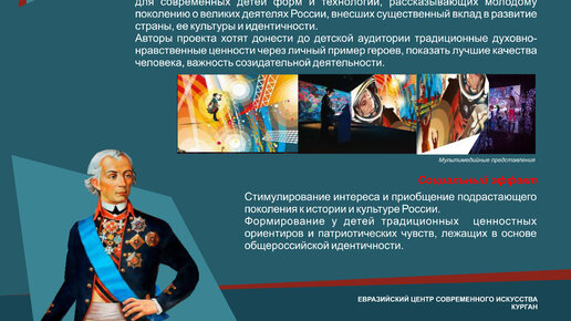Культурно-просветительский проект для детей «Русские супергерои. Выдающиеся личности в истории России» стал победителем грантового конкурса Президентского фонда культурных инициатив. С 1 августа 2023 года команда Евразийского центра современного искусства начнёт работу над проектом. В серии публикаций предлагаем более подробно познакомиться с программой. Обоснование соответствия творческой концепции проекта тематическому направлению. Реализация проекта предполагает создание и показ мультимедийных...