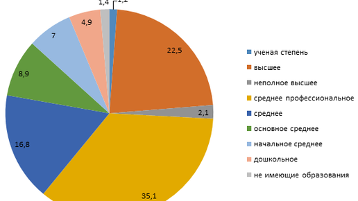 По данным переписи населения 2021 г., в России лидерство занимает население со средним профессиональным образованием (более трети всех россиян возрастом 6 лет и более) (рис.). Более пятой части населения России имеет высшее образование. Третье место занимает когорта населения со средним образованием (11 классов), на их долю приходится около 17%. Около десятой части граждан РФ закончили 9 классов. Начальную общеобразовательную школу окончило 7% населения, а детские садики - около 5%. Далее по этому...