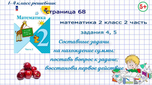 Стр. 68 № 4, 5 математика 2 класс 2 часть Моро 2023 г. составные задачи на нахождение суммы / 1-4 класс решебник