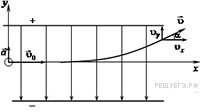 Электрон влетает в плоский конденсатор со скоростью параллельно пластинам (см. рисунок), расстояние между которыми d. На какой угол отклонится при вылете из конденсатора вектор скорости электрона от первоначального направления, если конденсатор заряжен до разности потенциалов Длина пластин Действием на электрон силы тяжести пренебречь...