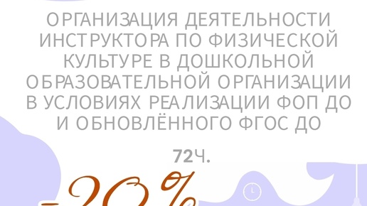Курс повышения квалификации "Организация деятельности инструктора по физической культуре в дошкольной образовательной организации в условиях реализации ФОП ДО и обновлённого ФГОС ДО (72 ч.)" со скидкой 20%. https://www.uchmet.ru/events/item/3890665/ Формат: дистанционно, круглосуточный доступ к записям занятий и материалам (офлайн) Форма обучения: заочная Содержание настоящей программы повышения квалификации предусматривает рассмотрение следующих методических аспектов: - Нормативно-правовое сопровождение...