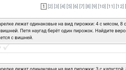 Задача 1: Задание может быть не только про пирожки, всегда внимательно читай условие, старайся понять, что у тебя спрашивают! Стоит выучить: N - общее количество тех или иных объектов в задаче. n - количество тех объектов, которые нам нужно найти. p - обозначение вероятности. p = n/N – формула вероятности, ее стоит заучить, отношение конкретноых объектов ко всем. Перейдем к вышепредставленной задаче: 1) У нас всего пирожков 4+8+3=15 , то есть: N=15 2) Нам нужно найти вероятность, что пирожок...