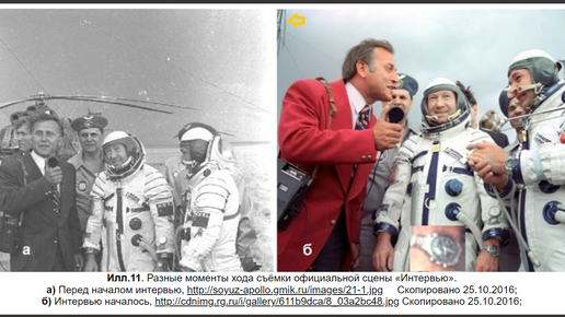 Александр Попов, доктор физико-математических наук, звезда телеэкрана говорит и пишет: "Разумеется, все изученные фотографии (илл.2, 4, 7, 11, 12) снимались не 21 июля 1975 года, а через два-три дня, когда космонавты прошли период первичной реадаптации к условиям земной силы тяжести." (Александр Попов пишет на своем сайте) "...примерно через три дня, то есть 25 июля 1975 года, космонавты уже довольно свободно владеют своим телом и вполне бодры. Тогда устраивается их встреча с корреспондентами." (Лебедев Н...