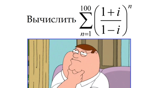 Школьная задача по математике, которую не решают 50 % студентов... Итак, требуется просто вычислить данную сумму от n = 1 до n = 100 от выражения, зависящего от комплексного числа, возведенного в переменную, по которой идёт суммирование...