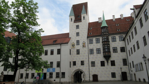 Почти в конце улицы Шпаркассенштрассе находится бывшая резиденция короля Людвига. Альтер Хоф. Рядом с ней возвышается хранилище 1264 года, которое называют Обезьяньей башней. Когда-то она была смотровой башней, затем пивоварней, домом соколов и, наконец, придворной бойней. К сожалению фасад Альтер Хофа с восточной стороны сегодня выглядит очень современным. но стоит зайти внутрь, дворик сразу превращается в средневековый, со старинными фонарями и деревянными балкончиками...