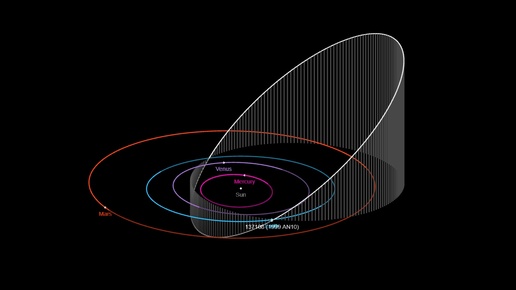 Интересно, что астрономы смогли проследить его положение на орбите в обратную сторону по времени. 1999 AN10 был обнаружен на фотопластинках 1955 года, что позволило исключить его столкновение с Землёй на ближайшие сотни лет. Большая полуось орбиты небесного тела составляет 218 млн км (95 млн км - перигелий, 341 млн км - афелий), период обращения вокруг Солнца составляет 1,76 года, наклонение орбиты велико и равно 39,9°, эксцентриситет (степень вытянутости) тоже немаленький 0,56. То есть он может быть ближе Венеры к Солнцу и дальше афелия марсианской орбиты...