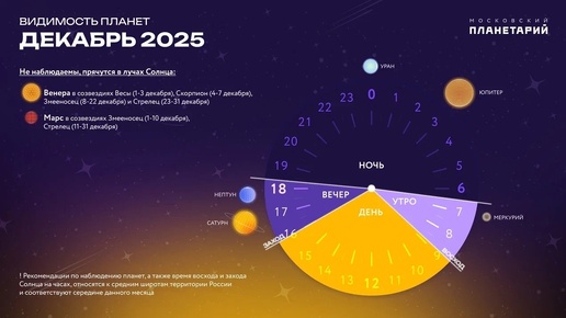 Декабрь 2025 года станет насыщенным месяцем для любителей астрономии: наступит астрономическая зима, сияние двух ярких звездопадов и редкие возможности понаблюдать за планетами. Об этом сообщили в группе ВК "Московского планетария". Планеты в декабре 2025: кто где и когда? Вечером над горизонтом можно будет увидеть: В ночное время в поле зрения попадут: Утром, перед восходом Солнца, появится Меркурий, который за месяц пройдёт сразу через четыре созвездия: Весы (1–14 декабря), Скорпион (15–17), Змееносец (16–30) и Стрелец (30–31)...
