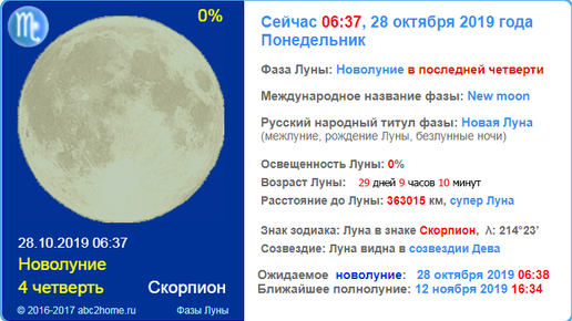 Новолуние 28 октября 2019, астрономические характеристики