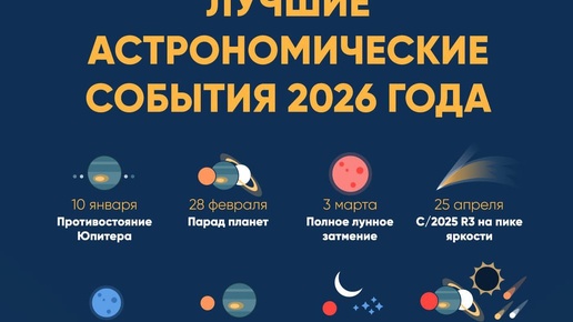 ) 2026 году нас ждет множество астрономических явлений. Мы выбрали по одному яркому событию на каждый месяц и составили из них календарь. Смотрите нашу инфографику, чтобы узнать, где и когда увидеть...