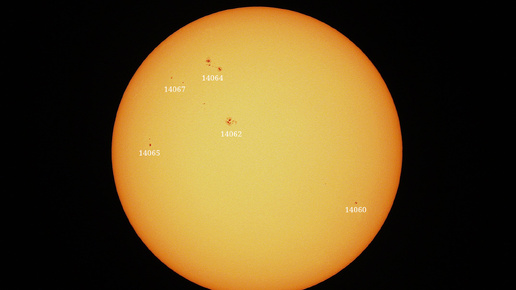 Группа 14062, которая расположена ближе всего к центру солнечного диска, по виду в чем-то напоминает бабочку. Не так далеко от неё видна 14064 богатая солнечными пятнами, будет интересно проследить за динамикой её развития. Интересно и то с помощью космической обсерватории SDO 19 апреля 2025 года на Солнце была отмечена крупная корональная дыра в южной части диска светила. Расположение самых интересных активных областей на диске Солнца на 19 апреля 2025 года...