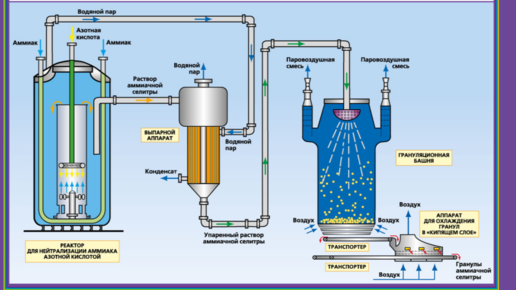 Реакторы В нижней части аппарата происходит доупаривание плава до массовой доли аммиачной селитры не менее 99,7% на пяти сетчатых тарелках провального типа, три верхние из которых снабжены обогревающими змеевиками. В агрегатах АС-60 выпаривание раствора аммиачной селитры происходит в несколько стадий. Сначала 62–64%-ный раствор поступает в выпарной аппарат I ступени, который работает по принципу «вползания» пленки внутри вертикальных труб. Представляет собой кожухотрубчатый теплообменник с примыкающей к его верхней части сепаратором...