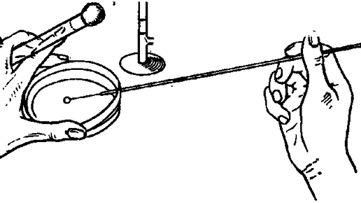 Клетки микроорганизмов для посева или приготовления препаратов берут бактериологической петлей или иглой, если микроорганизмы выращены на плотной среде. В том случае, когда нужно приготовить препарат или пересеять культуры микроорганизмов, выросшие в жидкой питательной среде, лучше пользоваться не петлей, а стерильной пипеткой. Бактериологические петли и иглы делают, используя тонкую проволоку из вольфрама или нихрома, которую закрепляют в металлическом или стеклянном держателе. Диаметр бактериологической петли - 4-5 мм...