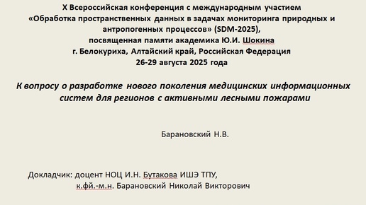 В конце лета мы представили наши первые результаты научного проекта 25-21-00017 “Детерминированно-вероятностный подход прогнозирования воздействия выбросов аэрозоля и углеродистых частиц от лесных пожаров на здоровье населения” на конференции в Белокурихе. Данный проект поддержан Российским научным фондом. Мы выполняем его с начала 2025 года. Конференция называется “Обработка пространственных данных в задачах мониторинга природных и антропогенных процессов”. Конференция имела статус Всероссийской с международным участием и была посвящена памяти академика Юрия Ивановича Шокина...