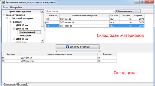 По умолчанию все панели будут из материала Бук, 16 мм. Этот материал хранится, условно говоря, на складе цеха, если принять, что окно Базиса – мебельный цех, где вы готовите детали и собираете мебель.