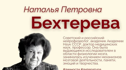 - выдающийся ученый и основатель Института мозга человека. Ее исследования функционирования мозга человека связаны с разработкой метода долгосрочных и краткосрочных имплантированных электродов, который позволил проводить исследования в условиях прямого многоточечного контакта с мозгом человека. Благодаря ее работе и работе ее коллектива, на базе которого был организован Институт мозга человека, ученые стали первыми в нашей стране, работающими с мозгом человека в таких условиях. Бехтерева была признана...