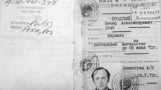 Виза в Израиль Это советская выездная виза № 208098 на постоянное жительство в Израиль. Вот как сам Иосиф Бродский описывает ее получение: 10 мая с.г. в 11 утра раздался телефонный звонок. Мужской голос спрашивал И.А. Бродского. «Кто говорит?» — сказал я. «Это из ОВИРа». — «Я вас слушаю». — «Ну вот, теперь вы знаете, откуда говорят. Не могли бы вы зайти к нам сегодня в удобное для вас время?» — «К кому?» — «Моя фамилия Пушкарев». — «Мог бы — часов в шесть вечера». — «Когда придете, обратитесь к референту, вас проведут ко мне»...