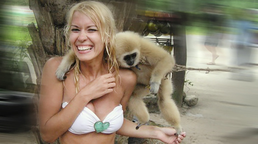 Снимки с обезьянками одни из самых популярных в сети, но будьте очень осторожны, ведь никогда не знаешь, что у любого животного на уме. Конечно это приносит огромную радость, особенно девушкам, орангутаны или гориллы могут искренне поцеловать или обнять, понравившуюся девушку. У них умственное развитие похоже на ум трехлетнего ребенка, с существенными отличиями, они отлично запоминают, если человек сделал для них добро или сказал нехорошее слово. Выше снимок, казалось бы милого гиббончика, но такие обезьянки всё крадут и не совсем безобидны...