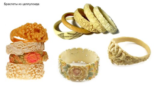 Целлулоид – это один из первых видов пластика, который стали использовать в изготовлении ювелирных изделий и бижутерии (дата изобретения 1856 год). Из целлулоида делали различные бусины, броши, пряжки, камеи, колье и ожерелья, а также браслеты. А также из этого материала изготовляли и другие дамские штучки: заколки, гребни, маленькие шкатулки, аксессуары для туалетных столиков, пуговицы, куклы, игрушки, рамки для зеркал и картин.