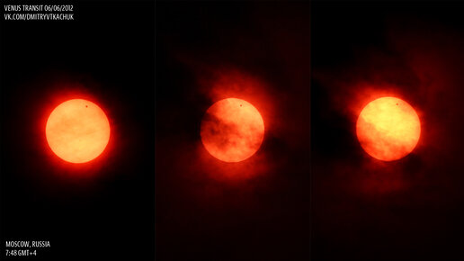 260 лет назад, 26 мая 1761 года ( 6 июня по новому стилю), наблюдая прохождение Венеры по солнечному диску, М. В. Ломоносов обнаружил наличие у неё атмосферы. Это необычное астрономическое явление происходит по схеме, которая повторяется каждые 243 года. Для земного наблюдателя — перемещение тёмного диска Венеры (видимый диаметр — примерно 1') по диску Солнца (диаметр — около 30') в течение нескольких часов. На фотографии вы видите это явление, которое повторилось с удивительной точностью 6 июня 2012 г...