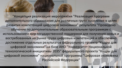 Разработана концепция реализации программ дополнительного образования для различных групп населения в целях развития компетенций цифровой экономики Целями осуществления мероприятия по реализации программ дополнительного образования для различных групп населения в целях развития компетенций цифровой экономики являются обеспечение дополнительных возможностей для получения гражданами РФ новых и востребованных на рынке труда цифровых компетенций и удовлетворение потребностей рынка труда в современных...