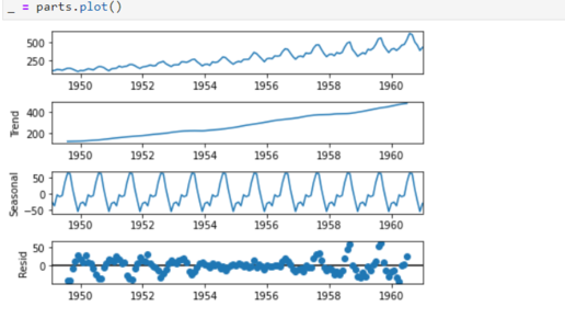 Для демонстрации загрузим набор данных о статистике пассажирских перелетов с 1949 по 1960 из библиотеки pmdarima: Разложение на перечисленные выше составляющие можно произвести с помощью функции seasonal_decompose из модуля statsmodels...