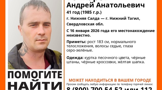 В Свердловской области разыскивают 41-летнего жителя Нижней Салды. Андрей Бочкарев неожиданно для семьи уехал в Нижний Тагил и перестал выходить на связь, рассказали ИА «Все новости» в отряде «ЛизаАлерт». Местонахождение пропавшего неизвестно с 16 января. По данным поисковиков, он спонтанно и без предупреждений вызвал такси и уехал в Нижний Тагил. Вышел из машины в центре города в районе улиц Циолковского и Пархоменко. Больше на связь салдинец не выходил, его телефон недоступен. Дома Андрея очень ждет семья...