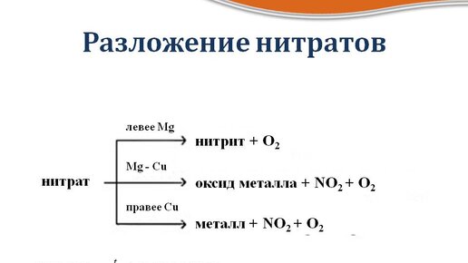 1. Разложение нитратов. Продукты термического разложения нитратов зависят от положения металла в ряду напряжений металлов: А) если металл левее mg (исключая Li): meno3 = meno2 +O2↑ Б) если металл от MG...
