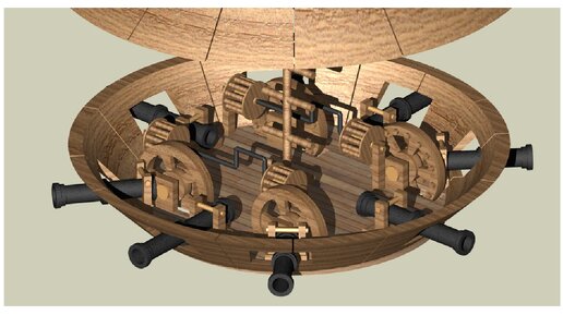 Лафет имел 6,5 метров в поперечнике и был примерно 3,5 метра высотой. В нем по кругу были расположены 16 легких орудий, так что они могли стрелять по всем направлениям...