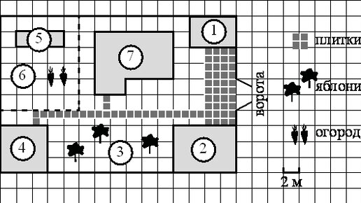 На плане изображён дачный участок по адресу: п. Сосновка, ул. Зелёная, д. 19 (сторона каждой клетки на плане равна 2 м). Участок имеет прямоугольную форму. Выезд и въезд осуществляются через единственные ворота. При входе на участок слева от ворот находится гараж. Справа от ворот находится сарай площадью 24 кв. м, а чуть подальше —— жилой дом. Напротив жилого дома расположены яблоневые посадки. Также на участке есть баня, к которой ведёт дорожка, выложенная плиткой, и огород с теплицей внутри (огород отмечен на плане цифрой 6)...