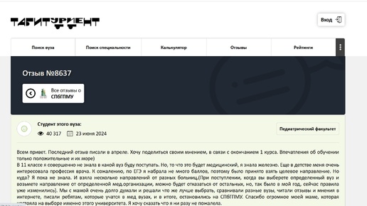 Публичные отзывы в Сети – не самый надежный источник информации, но если эти отзывы достаточно подробные, с содержательными деталями и описаниями, они становятся полезным дополнением к официальным сообщениям. На сайте отзывов «Абитуриент» мы с интересом ознакомились с отзывом студентки, окончившей первый курс педиатрического факультета СПбГПМУ в 2024 году. Публикуем его без правок (кроме орфографии и пунктуации). «Всем привет. Последний отзыв писали в апреле. Хочу поделиться своим мнением, в связи с окончанием 1 курса...