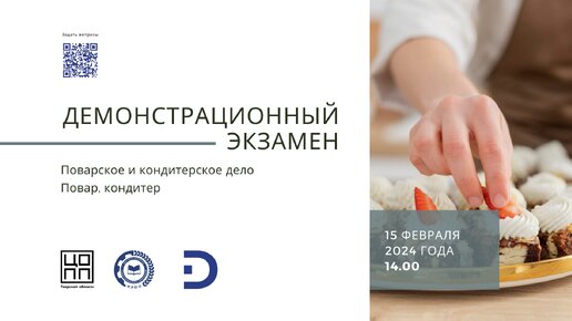 Департамент обеспечения и развития системы оценки качества профессионального образования Института развития профессионального образования приглашает представителей системы среднего профессионального образования и всех заинтересованных лиц 15 февраля 2024 года в 14:00 на онлайн-брифинг «Проведение демонстрационного экзамена в 2024 году по профессии 43.01.09 Повар, кондитер и по специальности 43.02.15 Поварское и кондитерское дело».