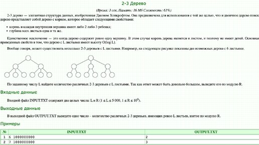 Задача из раздела комбинаторика, но на мой взгляд - это в чистом виде динамическое программирование. Давайте разбираться: Давайте посмотрим на последний ряд дерева. Понятно, что все листья разбиваются на группы по 2 или 3. Научимся считать количество разбиений методом динамического программирования. База динамики: 2, 3 и 4 элемента разбиваются единственным способом.