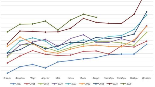 Динамика из года в год, можно наблюдать, когда были какие-то событие мировые, как они влияли на выручку и количество заказов - интересно, что если не реагировать на события то результаты становятся хуже. Но в целом, если все стабильно, графики по годах обычно похоже. Тут есть и минус, значит новых решений не придумано, прорыва не случилась, но есть понятность и стабильность модели. Мы наблюдали такие события в 2014 (крым наш), пандемия, сво, санкции, ослабление рубля, налоговые изменения...