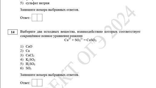 Ответы выложим у нас в телеграм–👇 Демонстрационный вариант ОГЭ 2024 г. Химия 9 класс. 13 Выберите два вещества, при полной диссоциации 1 моль которых образуется 2 моль анионов. 1) нитрат магния 2) гидроксид бария 3) хлорид натрия 4) фосфат калия 5) сульфат натрия Запишите номера выбранных ответов. Ответ: 14 Выберите два исходных вещества, взаимодействию которых соответствует сокращённое понное уравнение реакции ОЕКТ ОГЭ 2024 Ca +SO, CaSO3 между схемой процесса, происходящего ...