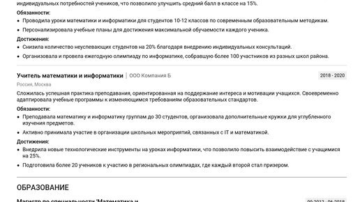 Пример резюме учителя математики и информатики 2025 - Как составить