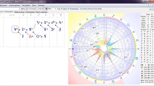 Добрый день всем. Сегодня поговорим о таком инструменте как "Формула души". Автор этой системы А.А. Астрогор, и информации на просторах интернета о ней не мало. Однако, я заметил, что никто не уточняет (может мне просто не попадалось) как ей правильно пользоваться. Для тех, кто не знает что это такое покажу наглядно. Выглядит эта программа так. Называется AstroFD, И ее демо версию можно легко скачать. И вот тут начинается самое интересное. Вся информация в интернете распространена в основном про левую ее часть, когда правая часть (с кругом) и таблица рядом с ней упускается...