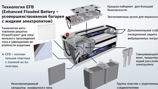 EFB-аккумуляторы — улучшенная заливная батарея, разработанная по новым технологиям, имеет продолжительный срок службы и надежна в эксплуатации. Аккумуляторы по технологии EFB имеют следующее улучшенное строение: - Ионопроницаемый сепаратор конвертного типа. - Между сепаратором и пластиной расположена полиэстеровая сетка, которая удерживает активную массу внутри, что обеспечивает высокий уровень заряда. - Для удерживания свинцовых пластин в правильном положении на сепаратор приклеено стекловолокно...