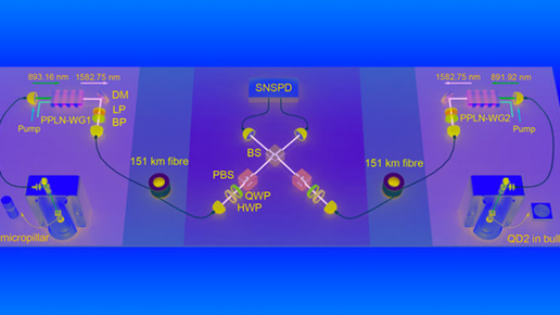 Физики из Германии и Китая добились интерференции одиночных фотонов, испущенных независимыми квантовыми точками, расположенными на расстоянии 300 километров друг от друга по оптическому волокну. Для борьбы с различием в длинах волн они использовали конвертер с оптической накачкой, а также уменьшали искажения в поляризации и форме волнового пакета с помощью контроля температуры и системы поляризационных фильтров. В результате видность интерференционной картины составила 0,93. Исследование опубликовано в Advanced Photonics...