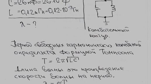 Задача: Колебательный контур имеет емкость 26 пФ и индуктивность 0,12 мГн. Какой длинны электромагнитные волны в вакууме создаёт этот контур, когда в нём происходят колебания с собственной частотой. Решение: Решение задачи довольно простое. В главе 16 находим формулу, которая определяет период собственных гармонических колебаний в контуре. Формула Томпсона. Далее, мы знаем, что длина волны равна произведению скорости волны на её период...
