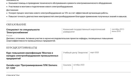 Пример резюме техника-электромеханика — отличный способ быстро понять, как составить свое собственное эффективное резюме 💡. Изучение готовых примеров поможет вам получить желаемую работу. На этой странице представлен детальный пример резюме техника-электромеханика и пошаговые инструкции по его составлению. Здесь вы найдете готовые примеры для специалистов разного уровня и учтете актуальные требования работодателей. Изучив этот подробный пример, вы сможете создать свое эффективное резюме с помощью нашего конструктора резюме...