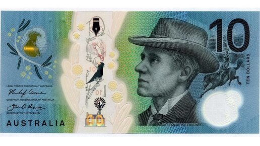 10 долларов Эндрю Бартон (банджо) Патерсон (1864-1941) на обороте Мэри Гилмор (1865-1962) Поэт - ну конечно же поэт – родился в штате Новый Южный Уэльс в многодетной семье. В те времена многодетные семьи не были редкостью ни в Австралии, ни в других странах...