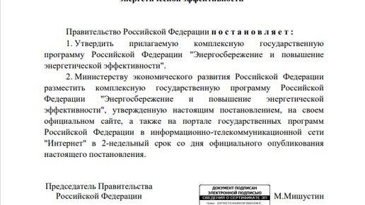 9 сентября 2023 г. Правительство Российской Федерации утвердило комплексную государственную программу Российской Федерации "Энергосбережение и повышение энергетической эффективности" (постановление № 1473) В 2008 году Указом Президента Российской Федерации от 4 июня 2008 г. № 889 "О некоторых мерах по повышению энергетической и экологической эффективности российской экономики" поставлена цель по снижению к 2020 году энергоемкости валового внутреннего продукта Российской Федерации не менее чем на 40 процентов по сравнению с 2007 годом...