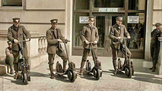 В двадцатом веке человечество совершило огромный рывок в техническом развитии, следствием чего стало появление множества новых устройств, профессий и даже сфер деятельности. Я решил собрать подборку изобретений конца XIX и ХХ века, которые мне показались весьма интересными. Однако не все изобретения, сделанные людьми прижились и вошли в нашу жизнь. Сотрудники почтового отделения демонстрируют свои новенькие скутеры «Autoped», Вашингтон, 1917 год. Ранняя разновидность мото-самоката, которая производилась с 1915 по 1921 год компанией Autoped Company, располагавшейся на Лонг-Айленде в Нью-Йорке...