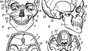 Череп - скелет головы позвоночных животных и человека. Различают осевой и висцеральный черепа. Осевой, или мозговой, череп представляет переднее продолжение осевого скелета туловища, разрастающееся вокруг головного мозга, органов обоняния и внутреннего уха. Висцеральный, или лицевой, череп представляет собой скелет переднего отдела глотки (кишечника), первоначально представленный жаберными (висцеральными) дугами, разделяющими жаберные щели. Череп человека а — вид спереди; б — вид сбоку; в — внутреннее...
