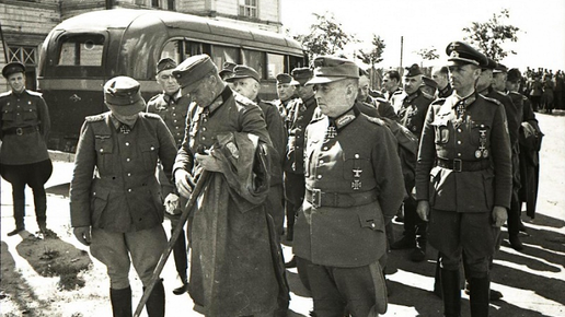 Пауль Густав Фёлькерс с другими пленными Немецкие офицеры в годы Второй Мировой войны мнили себя сверхлюдьми, настоящими "рыцарями" и непобедимыми воинами. И действительно, немцы были сильными и опытными врагами. Под их сапогом капитулировала практически вся Европа. По их стратегическому плану уже через пару месяцев после начала войны они должны были пройти парадным маршем по Москве. И храбрый воин генерал Пауль Густав Фёлькерс действительно был среди тех, кто прошел маршем по русской столице. Только вот не в начале войны...